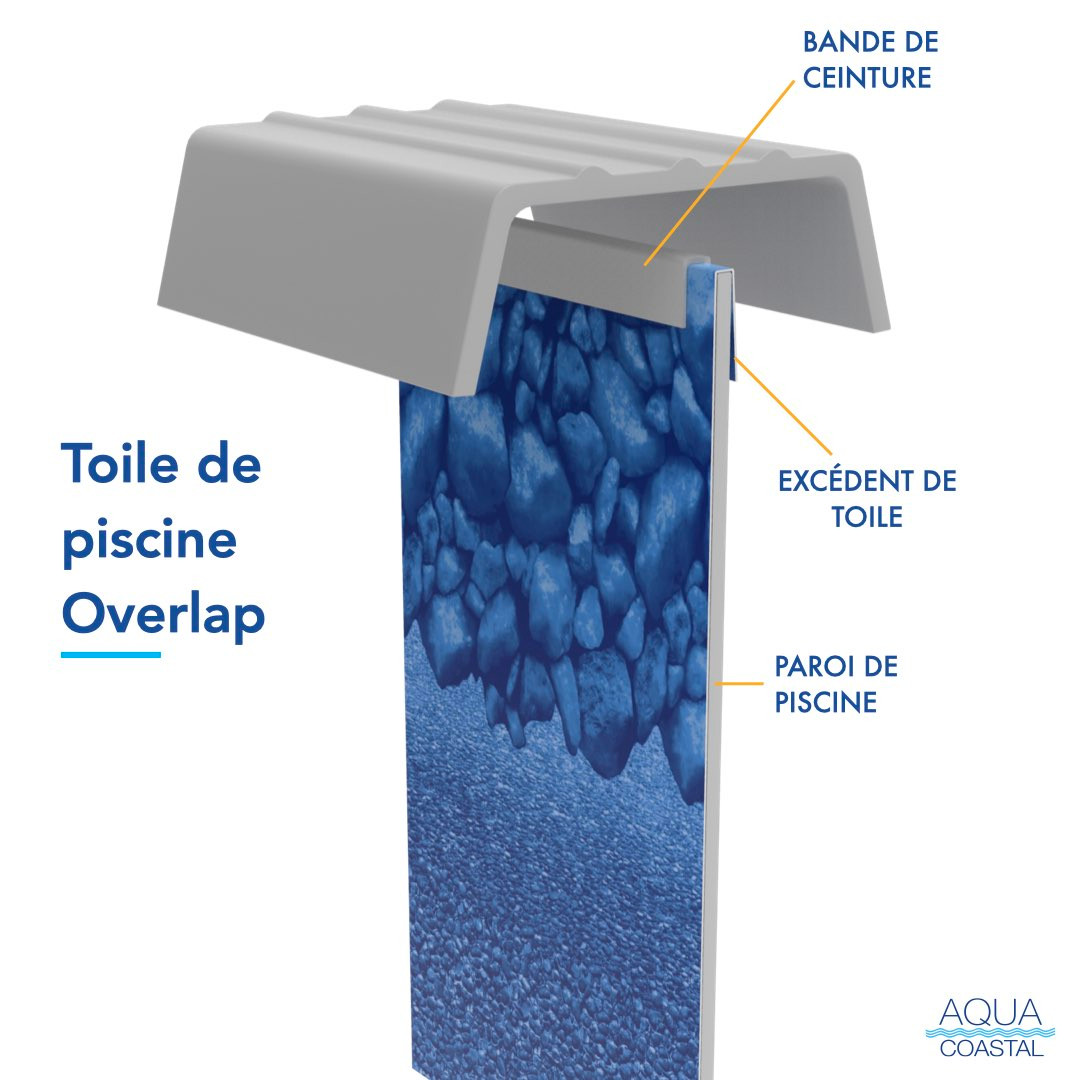 Une toile 15' x 30' ovale Reef à chevauchement est conçue pour se replier directement par-dessus le rebord du mur de votre piscine hors terre. La toile est maintenue en place à l’aide de bandes de fixation (coping strips) qui se clipsent sur le mur pour la retenir solidement. Si vos bandes de fixation actuelles sont encore en bon état, elles peuvent être réutilisées lors de l’installation, ce qui rend le remplacement simple et économique.