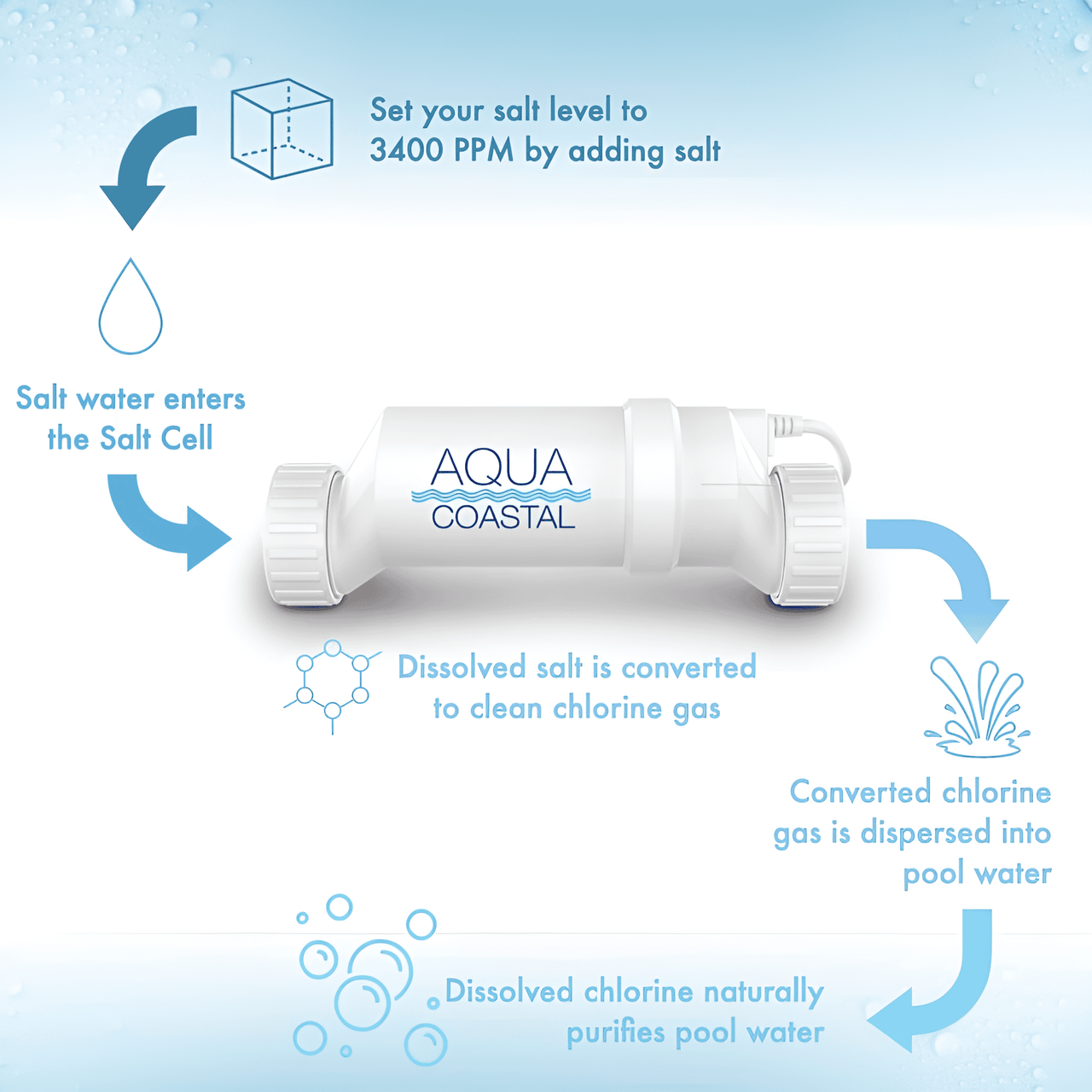 ATTN: ProSalt salt cell is not produced, manufactured, or sold by Hayward. Neither Aqua Coastal nor its salt cell is affiliated with Hayward Industries, Inc. The use of above model and system compatibility designations are included for informational purposes only.